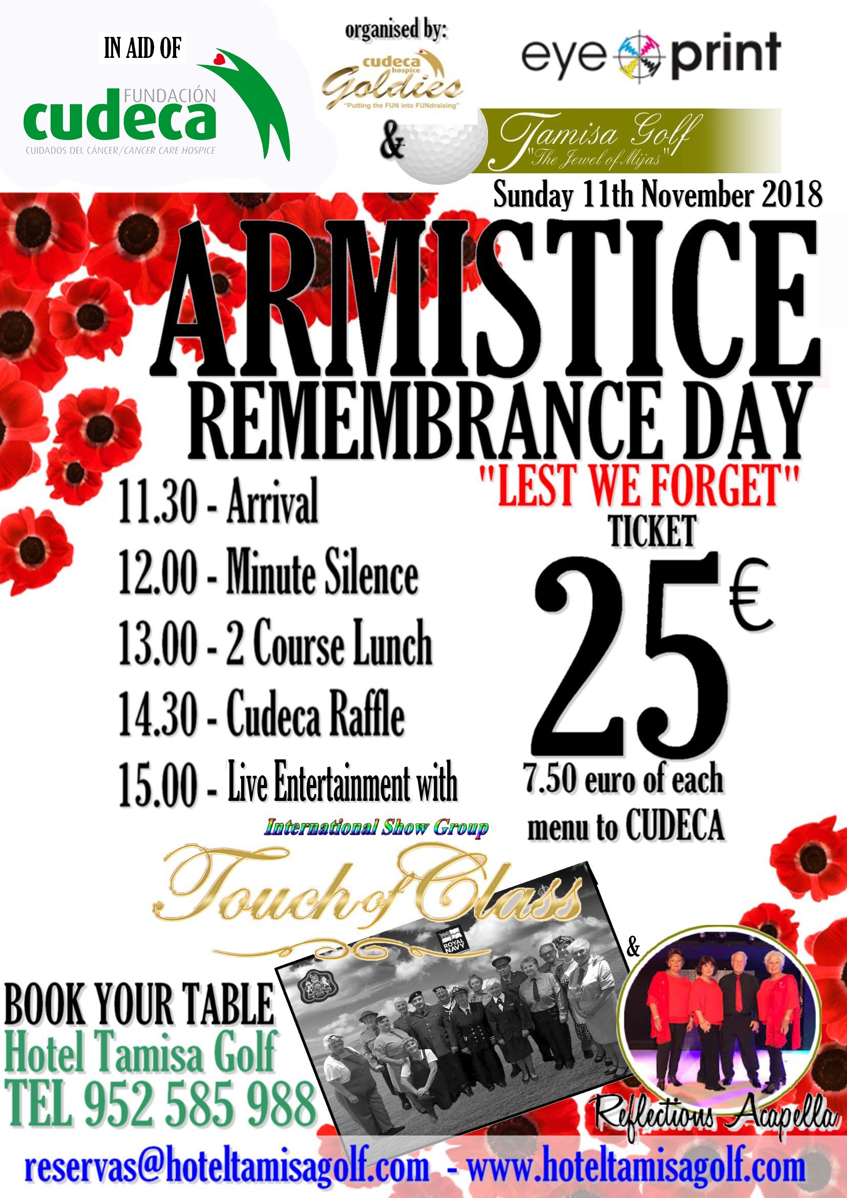 A day to remember with The Cudeca Goldies! Come and join the Cudeca Goldies for a day of Remembrance and Appreciation on Sunday, 11th November 2018 for “Armistice Day” at the Tamisa Golf Hotel, Camino Viejo de Coin from 11.30am to help us.
