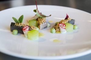 Sunflower shortbread cookie, Label Rouge bonbon, liquid olives, red garlic and Kimchi salmon.