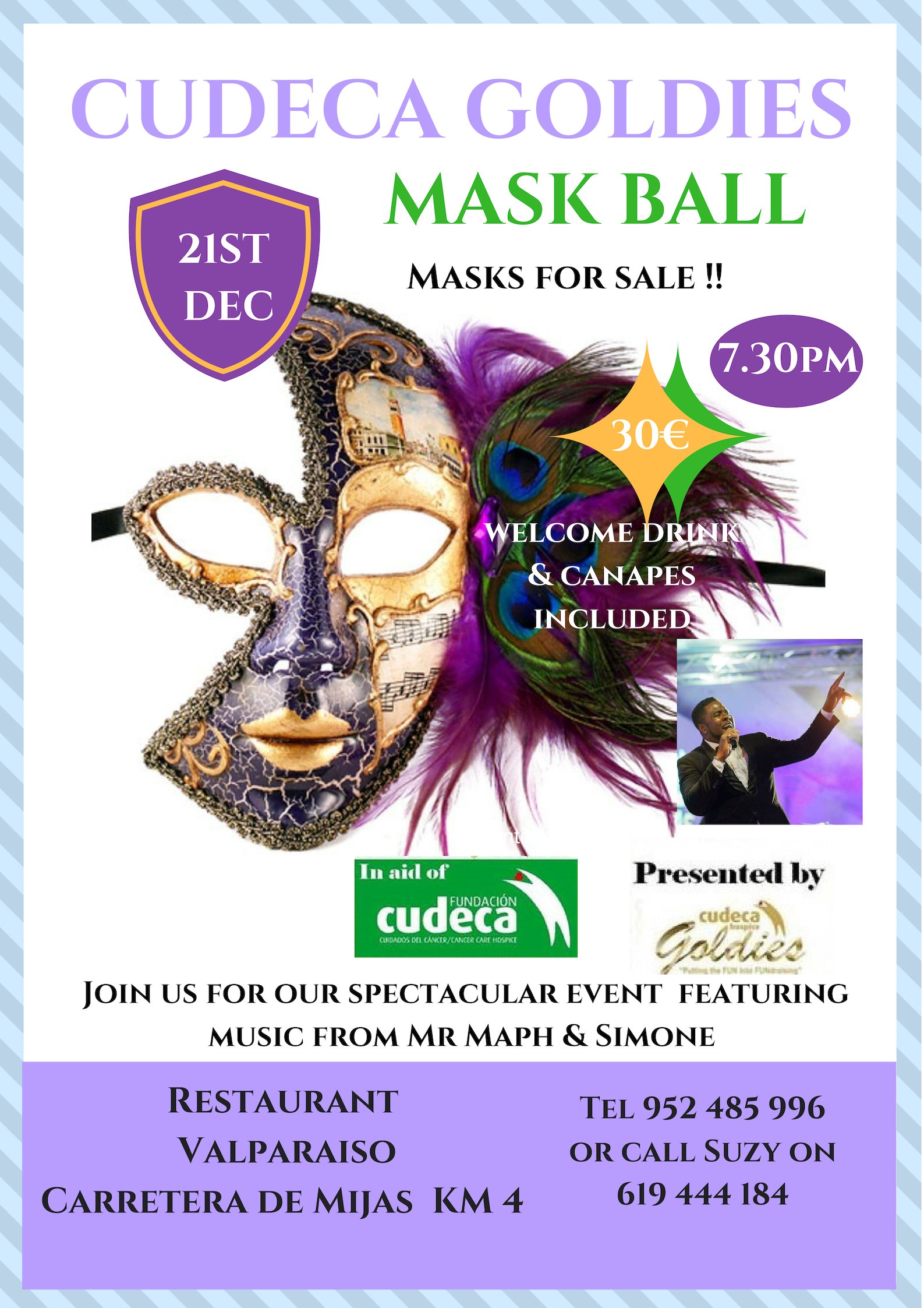 In addition to raising money for the Costa del Sol’s only hospice, guests will be welcomed to a spectacular event featuring live music and entertainment from Simone & Mr Maph presented by the glamourous Cudeca Goldies. Masks will be on sale in aid of Cudeca or make your own! Guests will enjoy a superb menu for only €30 with a welcome drink & canapes included. All proceeds raised will be donated to help us.