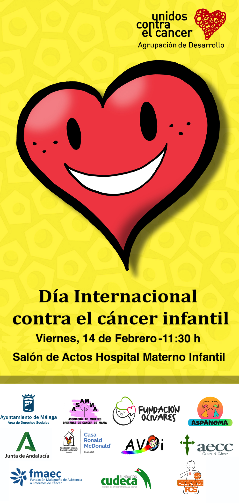 El próximo 14 de febrero a las 11:30h en el salón de actos del Hospital Materno Infantil de Málaga tendrán lugar los actos conmemorativos del día mundial del cáncer infantil, estos actos tienen el propósito de concienciar y difundir la investigación, la lucha y el apoyo a los que sufren esta enfermedad.
