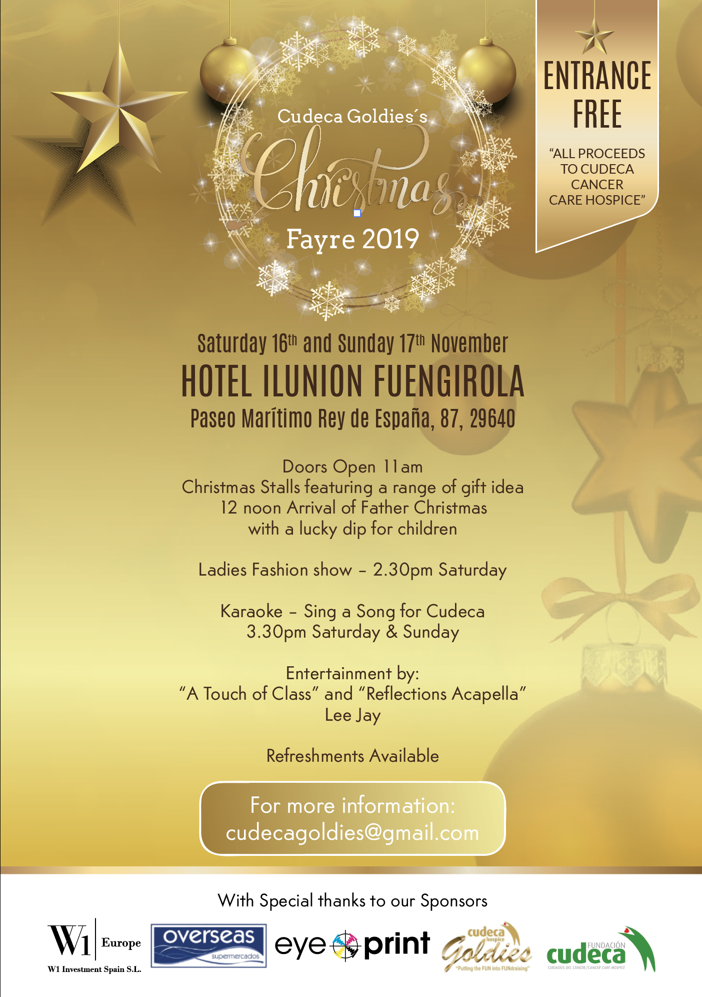 El sábado 16 y domingo 17 de noviembre el grupo de voluntarios “Cudeca Goldies” van a celebrar el evento “Feria de Navidad” a beneficio de la Fundación Cudeca en el Hotel Illunion en el Paseo Marítimo de Fuengirola (cerca de Los Boliches).
