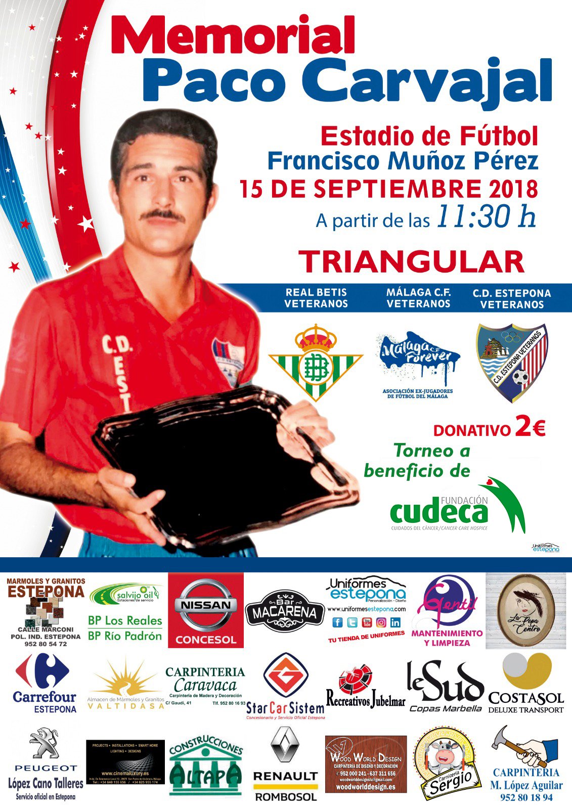 En esta tercera edición del Memorial Paco Carvajal se celebrará un triangular amistoso entre el Real Betis de Veteranos, el Málaga C.F. Veteranos y el C.D. Estepona Veteranos uniendo fuerzas e ilusión para compartir con su afición este memorial por la figura del tan querido Paco Carvajal, figura emblemática de Estepona y de su fútbol. La entrada solidaria será de 2€ por persona destinada íntegramente a ayudarnos.