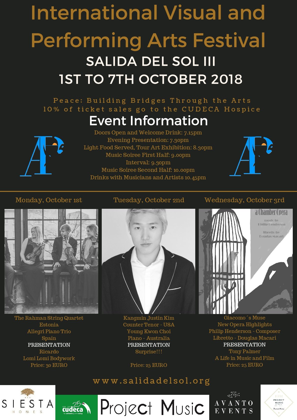 S A L I D A D E L S O L III, International Visual and Performing Arts Festival, is in its 3rd edition on the Costa del Sol and encompasses 7 EXQUISITE EVENING CONCERTS over 8 days organised by Project Music (PM) in the stunning venue of AVANTO THEATER at the beach, La Cala de Mijas.