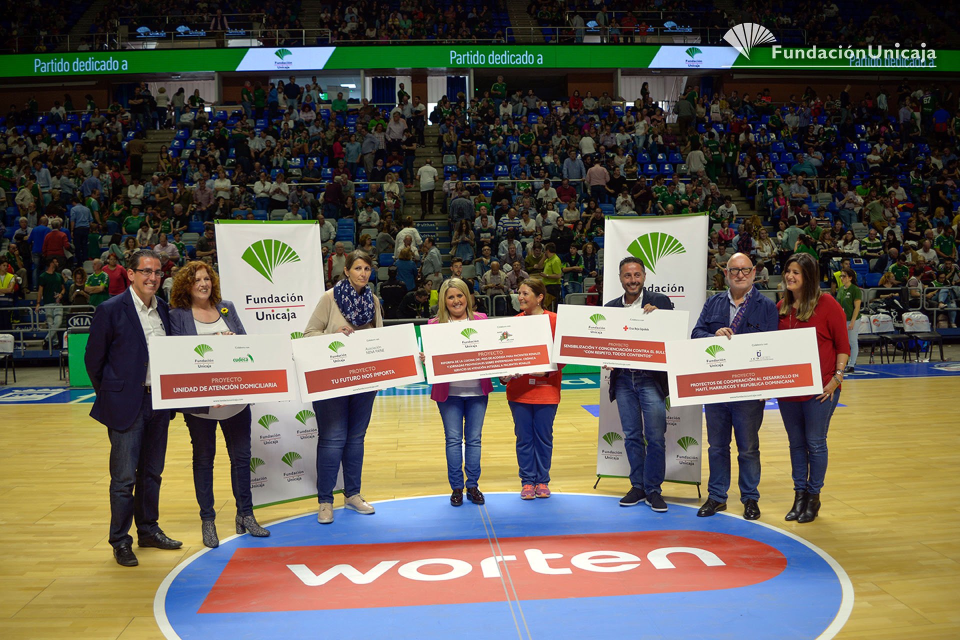 During the break of the match, the General Manager of Unicaja Foundation, Mr. Sergio Corral, presented the charity cheque to CUDECA Hospice, the Red Cross, the Institute for Cooperation for Sustainable Development (Icodes), the Association for the Fight against Kidney Diseases (Alcer) and the association Nena Paine.