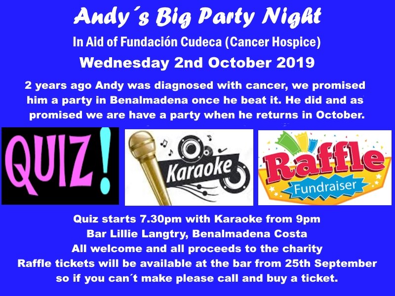 Mañana miércoles 2 de octubre tendrá lugar a partir de las 7.30pm, una fiesta/karaoke : "Andy´s Big Party Night" en el Bar Lillie Langtry , Benalmadena Costa, a favor de la Fundación Cudeca.