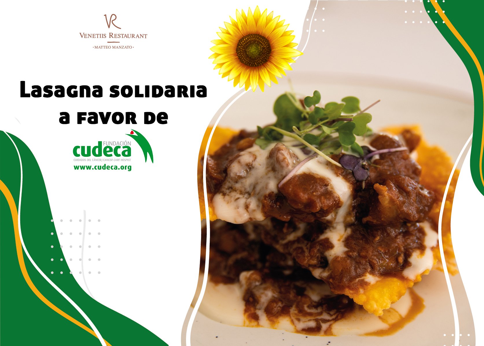 Venetiis Restaurant - Matteo Manzato es un restaurante de cocina fusión italomalagueña ubicado en Benalmádena, y quiere ayudar de forma continua con un plato solidario. Se trata de su lasagna de chivo lechal malagueño y queso montés de Málaga, y por cada venta de esta elaboración destinará 1€ para los cuidados que ofrecemos a personas en el final de sus vidas.