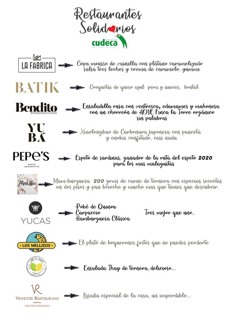 Actualizamos la información de los restaurantes que están colaborando con la fundacion Cudeca en su campaña de Restaurantes Solidarios, cada uno de ellos tiene un plato solidario del cual donan un euro a la Fundación.