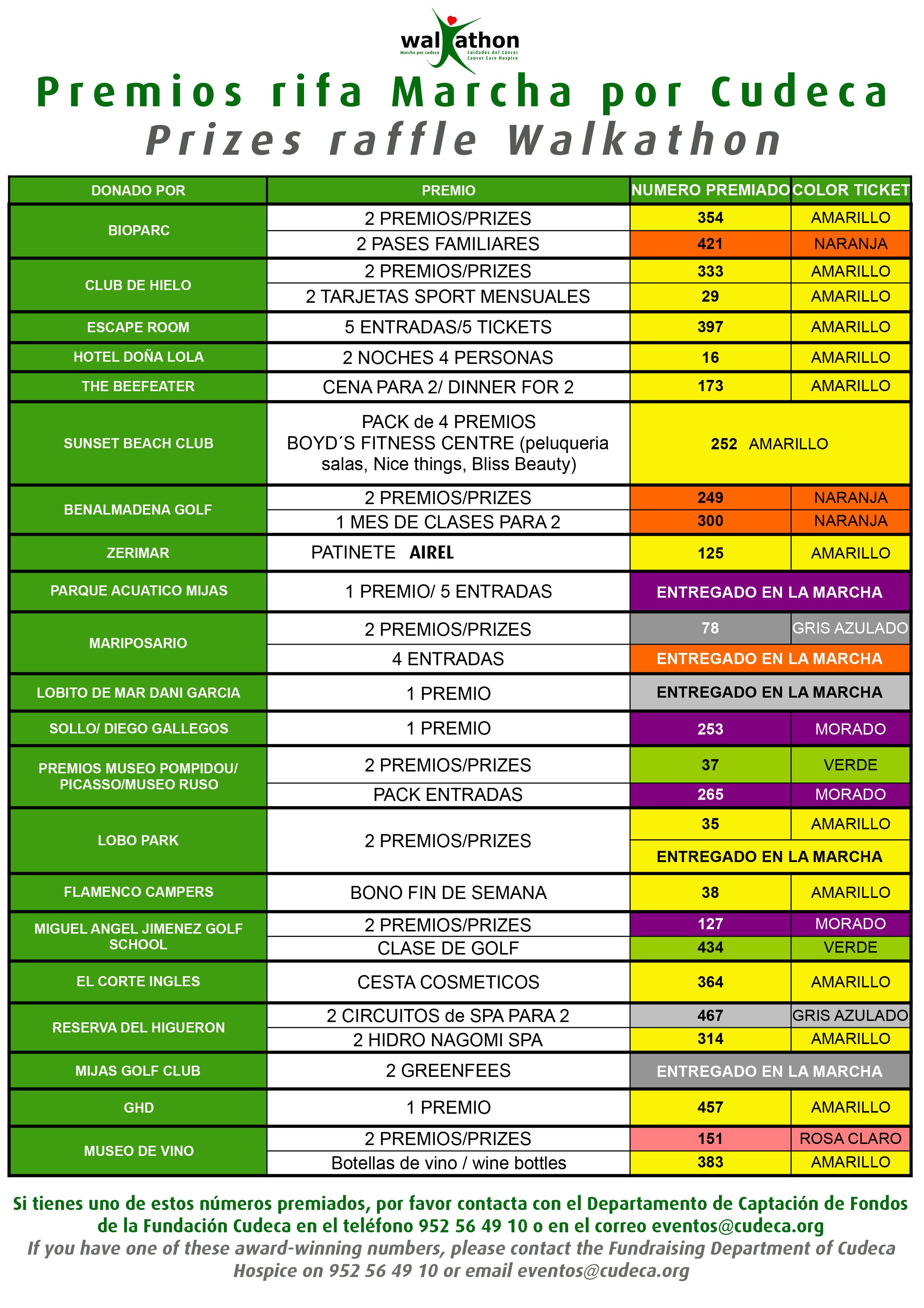 If you have one of these award-winning numbers, please contact the Fundraising Department of Cudeca Hospice on 952 56 49 10 or email eventos@cudeca.org