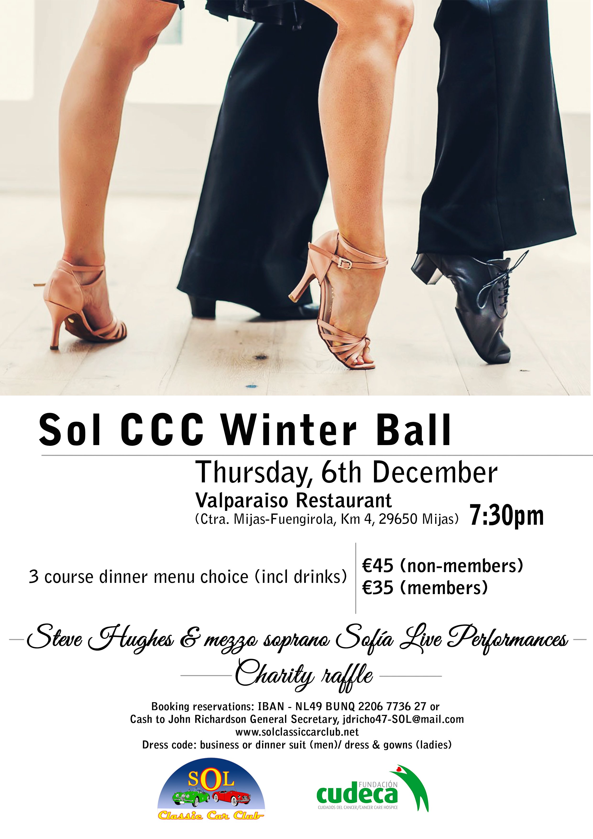 To make a booking payment: Club events bank account, including the words “name & winter ball”; IBAN - NL49 BUNQ 2206 7736 27, this is BUNQ Bank which is in SEPA (Single European Payment Area) or CASH addressing John Richardson General Secretary, jdricho47-SOL@mail.com. Full details from www.solclassiccarclub.net
