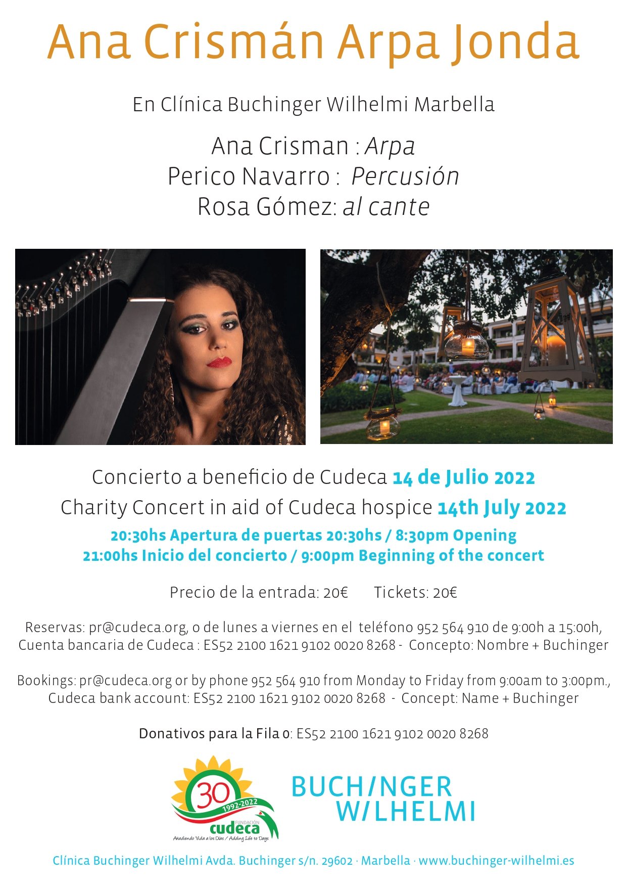 - Ana Crismán con su Arpa Jonda ofrecerá un concierto único en los jardines de la clínica marbellí acompañada de Perico Navarro a la percusión y Rosa Gómez al cante el jueves, 14 de julio, a partir de las 20.30h.