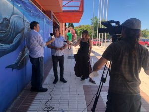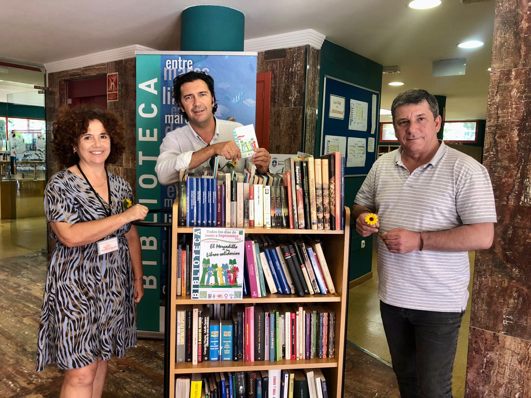 Enrique Pablo Centella Gómez, Councillor for Education, Culture, Citizen Participation and Housing, together with Mayte Ortigosa Delgado, library technician, and Jorge López, the Foundation's communications and fundraising technician, presented the flea market and thanked users for their donations, which make this flea market and the resulting fundraising possible.
