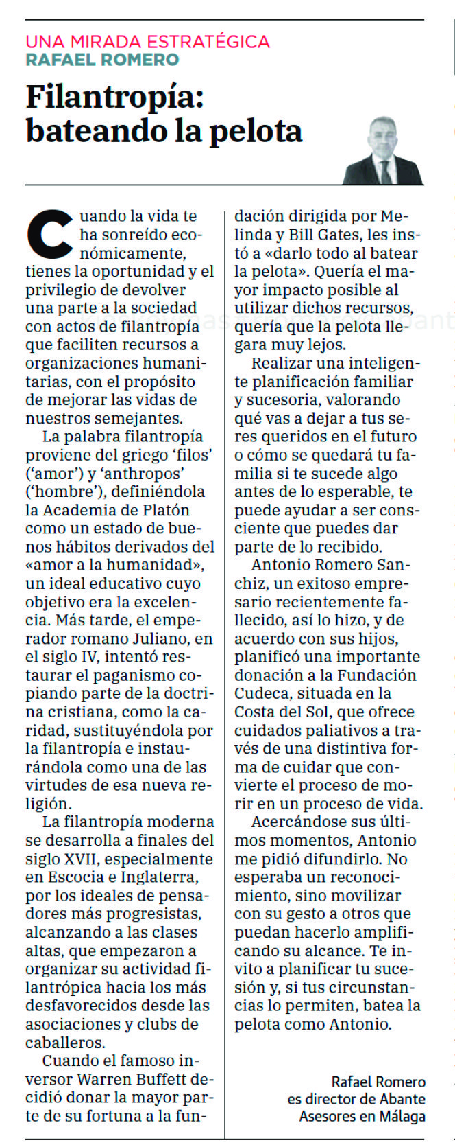 Antonio Romero Sanchiz was one of those friends who had been part of Cudeca Hospice since its beginnings, staying close and advising from his vision as a successful entrepreneur. We met him when, in 1991, Antonio had just become a widower with 3 young children. His wife had died of cancer and when he read in an English newspaper that a British lady wanted to start a Hospice, he felt the need to contact her, firstly looking for help, but also curious to know more about this challenging project.  The moment he met Joan Hunt, he became part of the project. Everything we at Cudeca were able to give him, he gave us back with good recommendations, valuable to guide the growth of such a complex organisation. He was a marketing and communications  specialist, an entrepreneur with many years of experience, very innovative and always interested in new challenges.