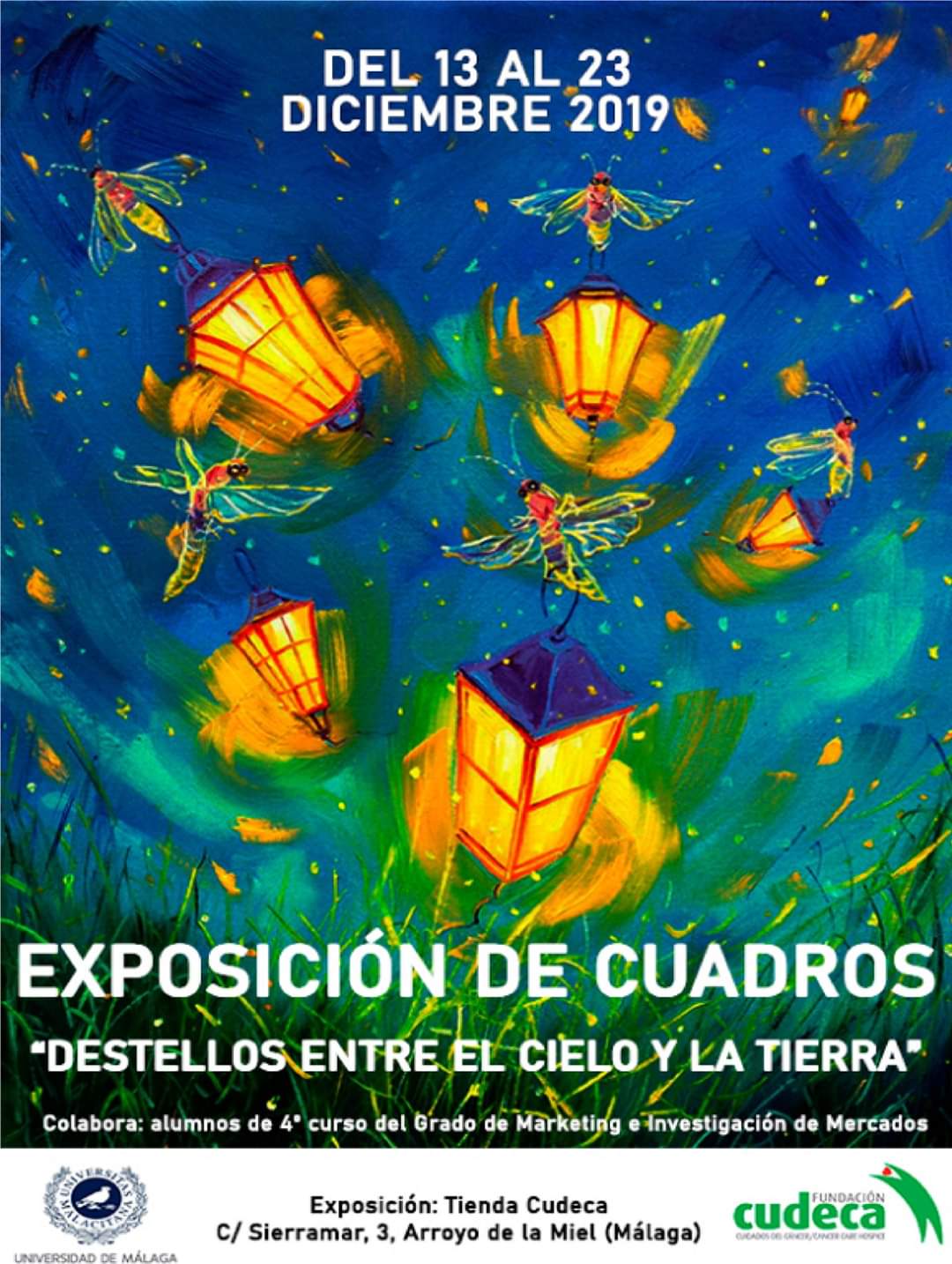 This year the exhibition "sparkles between heaven and earth" will be held from 13 to 23 December. The paintings will cost between 10 and 25€. This is an initiative of Maria Dolores García Sánchez, Professor in the Area of Commercialization and Market Research, Department of Economics and Business Administration of the University of Malaga with students of the course of Commercial Communication II.