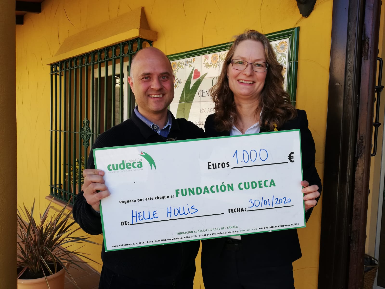 On 4 February, Helle Hollis Marketing Manager Christine Fleischer presented their annual cheque donation of €1,000 to our Cudeca Communication & Fundraising Manager Angel Krebbers at our palliative centre to help continuing our special kind of caring.
