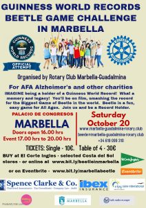 On Saturday, 20th October from 4pm, the first English Speaking Rotary Club on the Costa del Sol will hold the Guinness World Records – Official Attempt – Beetle Game Challenge at Rotary Club Marbella – Guadalmina at the Palacio de Congresos in Marbella in aid of many different charities, including Cudeca Cancer Care Hospice.   Doors will be opened at 4.00pm and the event will start at 5 PM until 8PM. A minimum of 256 players are needed to beat the record. Tickets are available at El Corte Inglés for a purchase of a physical entrance ticket; or online at these two sites: www.bit.ly/beetleinmarbella and at Eventbrite on www.bit.ly/marbellabeetle. Entrance tickets cost: €10 (single) & €30 (table of 4).   This Guinness World Records Beetle Game Challenge (official attempt) in Marbella has been organized by Rotary Club Marbella – Guadalmina in aid of many different charities as AFA Alzheimer and Cudeca Hospice. For all attendees, this will be the perfect opportunity to become a holder of a Guinness World Record. The event will be filmed, as the record of the Biggest Game of Beetle in the world is smashed. There will also be wine & food bar, music and entertainment during the game, as well as many prizes including a Golden Beetle, plus Hogan´s Guinness.   Many different charities will hold a stand of their own to promote their local causes, among all Cudeca Cancer Care hospice will be found holding a table with information, tins and sunflowers to sale. Guests and attendees will have the chance to get to know more about CUDECA when approaching the stand and purchase a sunflower for a voluntary donation. The CUDECA volunteers will also give information on how to become a regular donor, organize a charity event and how to locate a tin in your business. The money raised in this event will go to the local charities exhibiting there.   What is a Beetle Drive? A Beetle Drive is a mass game of Beetle and is played with pencil, paper and dice. It´s a fun game for all ages from 5 to 105. Players have one dice for every group of 4, but all play as individuals. They must roll certain numbers to be able to draw all the parts of a Beetle.   The first person in the hall to complete a Beetle, shouts “Beetle” and wins a prize. Each body part has numbered values and they must be drawn in a specific order to completing the Beetle. It is not as easy as it seems and more fun than it may sound.   Winners at each table plus one other then move to a different table and another round begins. Before and after the drive there is food, music and entertainment. And plenty of time to visit sponsors´s stands, NGOs and exhibitions. Guinness World Record Events generate excitement and interest from the public and the media. This is an official event and can use the Guinness World Records logo and merchandise.
