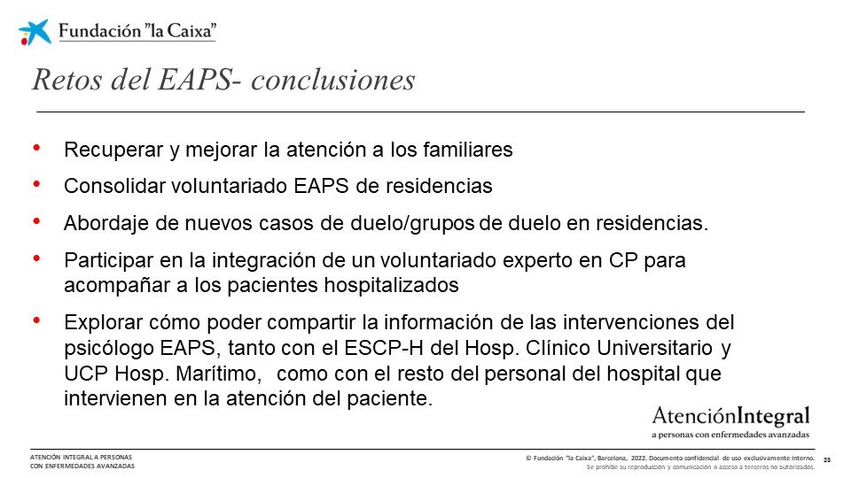 “la Caixa” Foundation Program for the Comprehensive Care of People with Advanced Illnesses has 45 psychosocial care teams (EAPS), belonging to non-profit organizations specializing in this field, with presence in all 17 Autonomous Regions of Spain and which carry out their work in both the hospital and home environments.